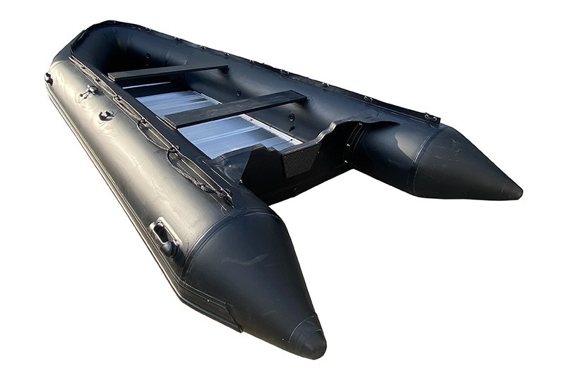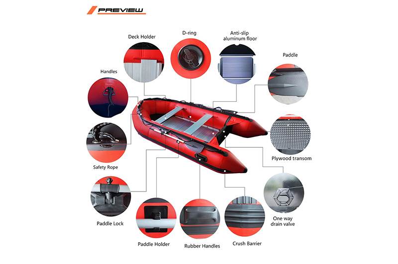 3.As standard every inflatable boat comes with an aluminum floor. The benefit of a hard floor is increased structural support that gives the boat better stability and handling in waves. Its also durable and if you drop your fish or cray on the floor its not going to put a hole in it.